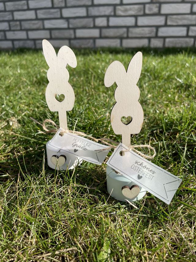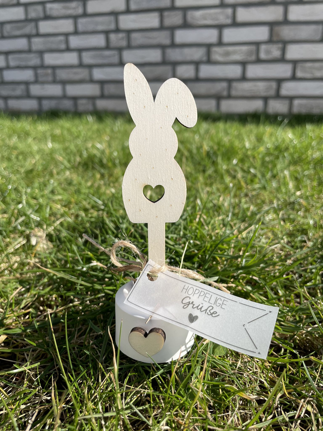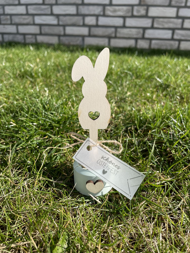 Der Hase ist auf einem kleinen, weißen oder mintgrünen Sockel befestigt, der mit einem kleinen Herz verziert ist. Eine rustikale Juteschleife und ein liebevoll gestaltetes Schild mit passender Aufschrift runden das Design ab. Ideal als Tischdeko, kleines Geschenk oder als besonderes Detail für deine Osterdekoration im Wohnzimmer, Flur oder auf der Festtagstafel.