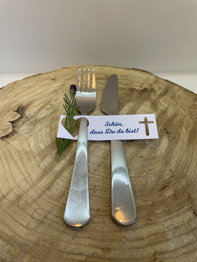Diese stilvollen Besteckanhänger setzen einen besonderen Akzent auf Ihrer festlichen Tafel. Perfekt für Taufe, Kommunion, Konfirmation oder andere religiöse Anlässe, begrüßen sie Ihre Gäste auf liebevolle Weise.