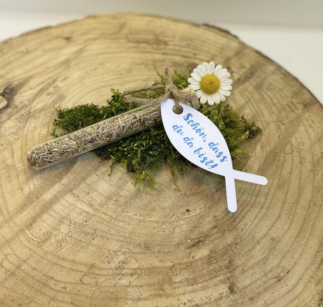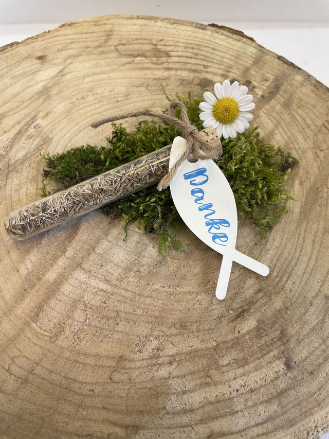 Ein besonderes Dankeschön für Ihre Gäste! Dieses liebevoll gestaltete Gastgeschenk besteht aus einem Reagenzglas, gefüllt mit Blumensamen, sowie einem Fischanhänger mit verschiedenen Sprüchen. Es eignet sich perfekt für Taufe, Kommunion, Konfirmation oder andere feierliche Anlässe und hinterlässt eine bleibende Erinnerung.