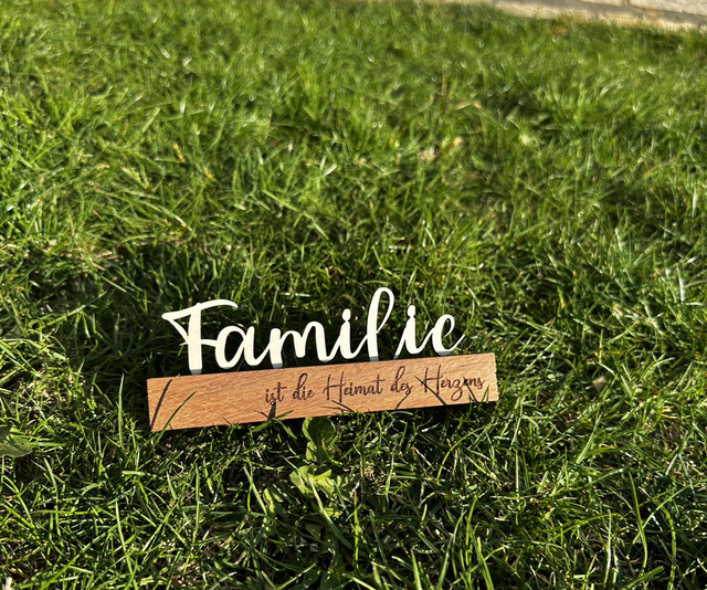 1. Schriftzug aus hellem Holz: „Familie“
